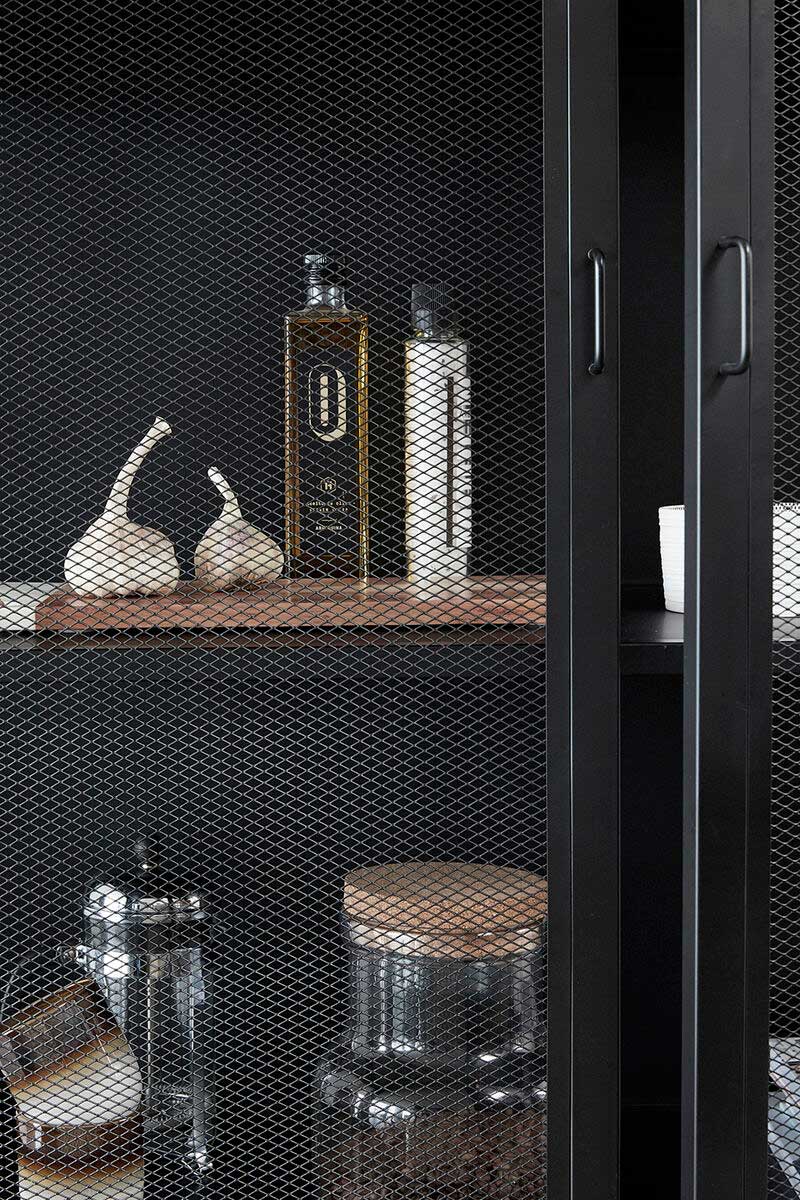 Skabet er lavet i sort metal og har et stort rum til opbevaring. Skabet kan bruges til opbevaring af tallerkner og glas, vaser, bøger, håndklæder og meget mere. Det sorte metal giver skabet et moderne look.