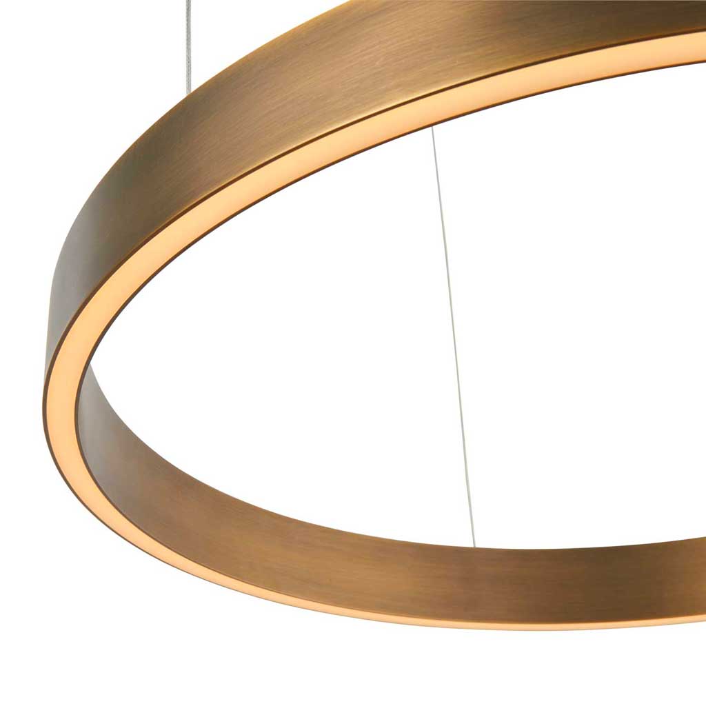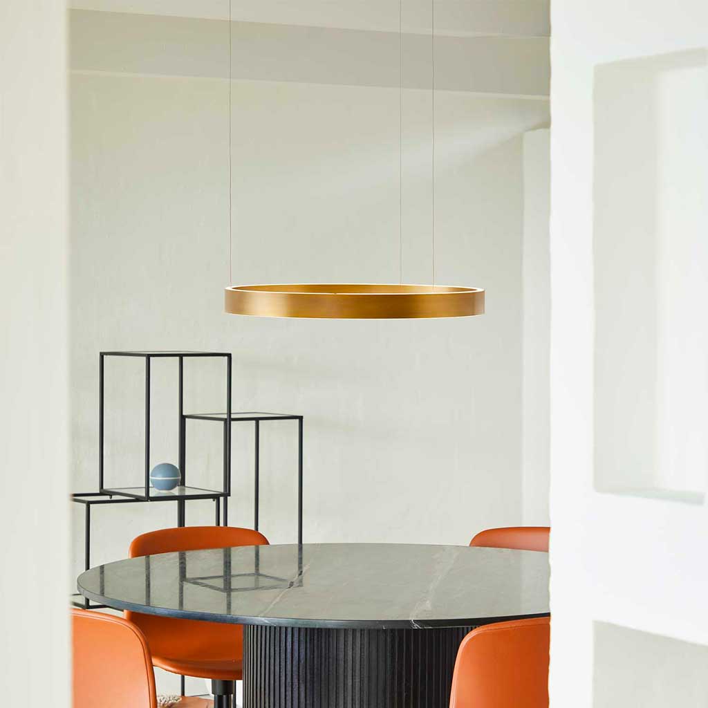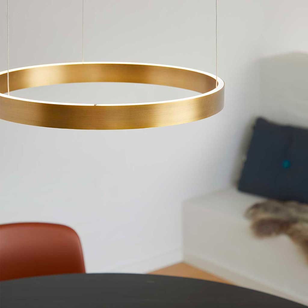 EOS 360 Large pendlen i mat messing er en elegant og moderne belysningsløsning, skabt til at tilføre rummet en varm og sofistikeret atmosfære. Med en imponerende diameter på Ø58 cm skaber lampen en markant og stilfuld tilstedeværelse, samtidig med at den bevarer et minimalistisk design, der passer ind i både private og professionelle omgivelser.