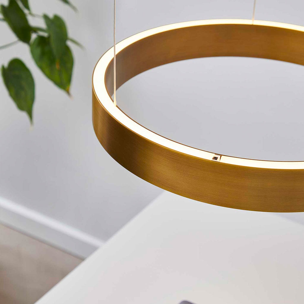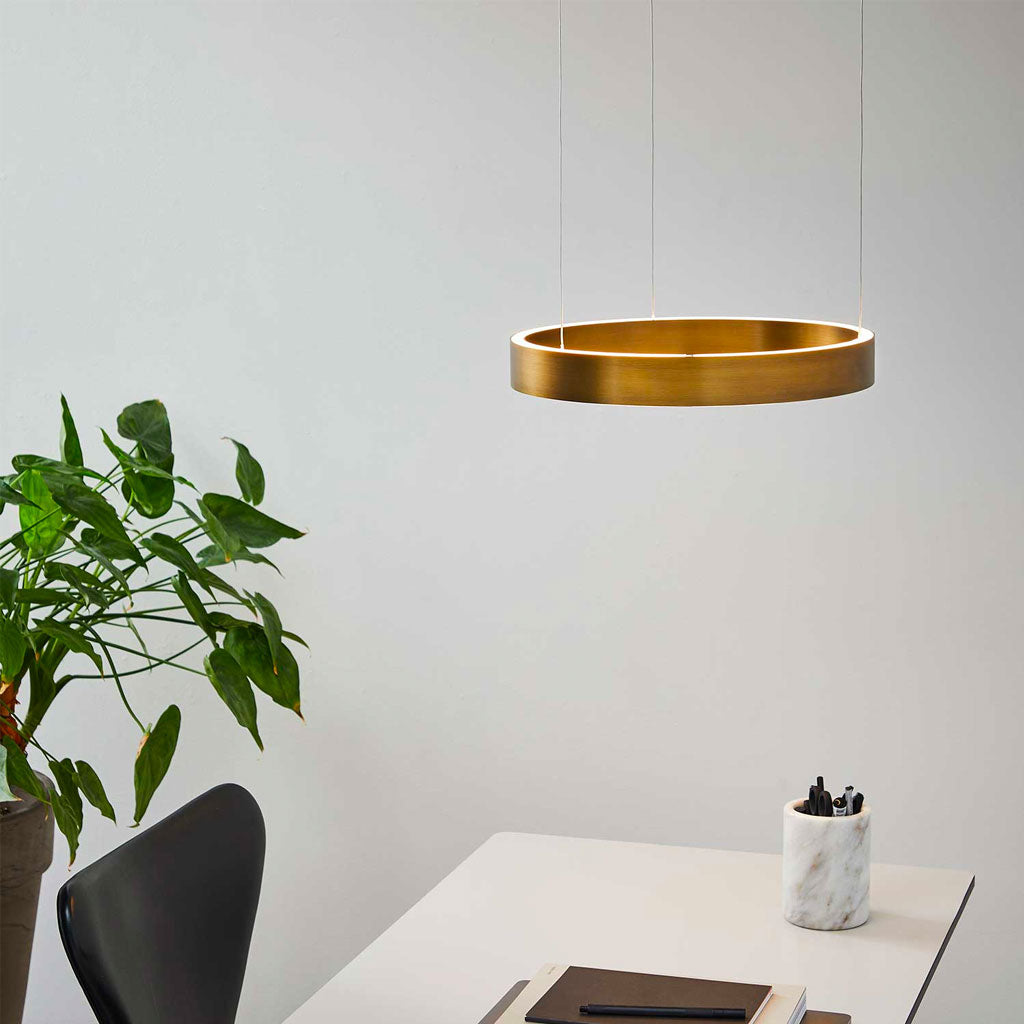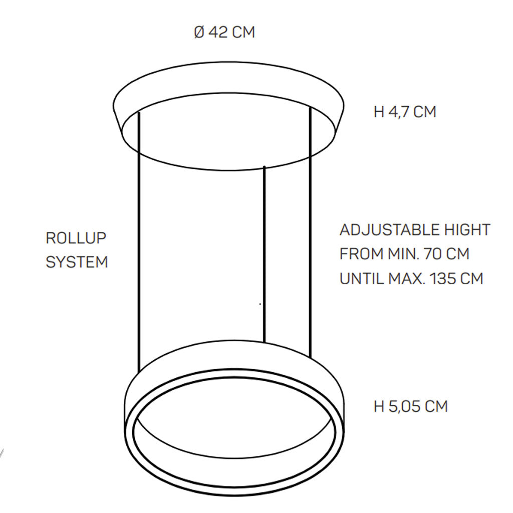 EOS 360 Small pendlen i mat messing kombinerer tidløst design med avanceret funktionalitet, hvilket gør den til et fremragende valg til forskellige rum og behov. Den runde pendel, der er udstyret med et praktisk roll-up system, kan justeres i højden fra 70 cm til 135 cm, hvilket giver fleksibel anvendelse i alt fra stuen til spisestuen. Med en diameter på 40 cm og en slank profil på kun 5,05 cm tilfører pendlen et raffineret og luksuriøst udtryk til indretningen. Den fås også i en større model med Ø 58 cm for en mere markant visuel effekt.