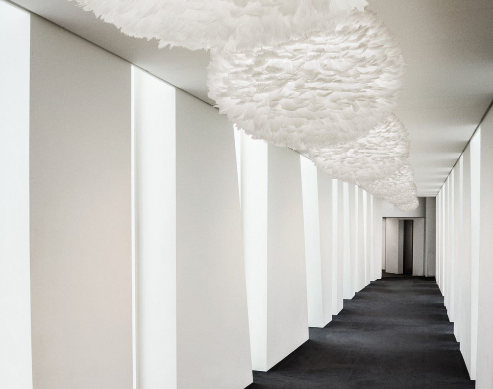 EOS er designet af Søren Ravn Christensen og giver et forfinet og feminint udtryk. Lampen består af hundredvis af påsatte gåsefjer, og giver et blødt og fyldigt lys. Lampen er overraskende nem at rengøre - du lader bare hårtørreren blæse støvet af fjerene. Skærmen kan bruges både til ophæng, bordstander og gulvstander.