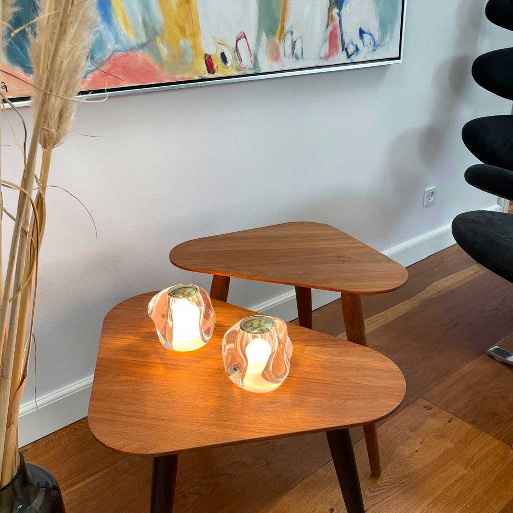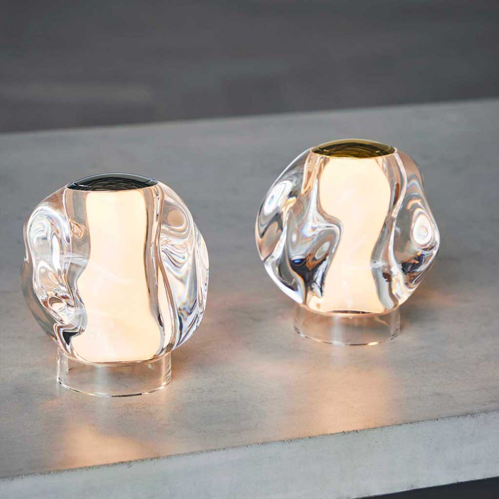 ICE BALL guld batteri bordlampen kombinerer funktionalitet og æstetik på en elegant måde. Lampens organiske form i klar akryl, fremstår som glas, hvilket tilføjer et sofistikeret udtryk. Guldfinishen på toppen giver et luksuriøst præg til lampen, hvilket gør den til et iøjnefaldende element i ethvert rum.