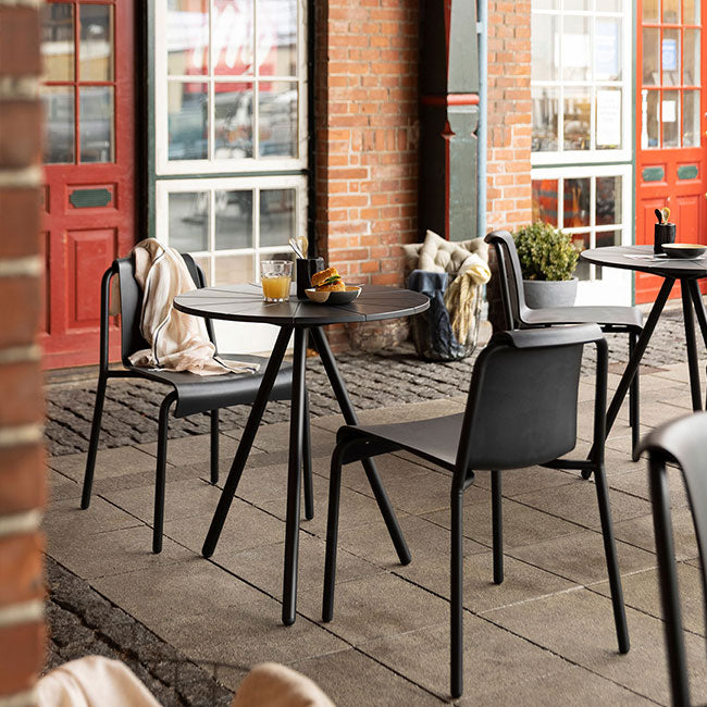 NAMI bordet består af et pulverlakeret stålstel med en smukt formstøbt plastbordplade. Bordpladen er fremstillet i Danmark og indeholder 97% dansk husholdningsplastaffald tilsat 3% farvepigment.