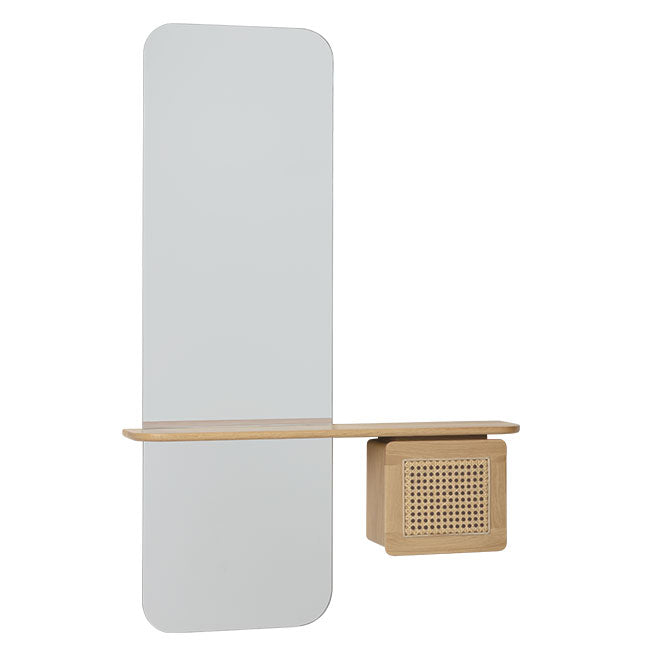 Det funktionelle One More Look spejl er en sand genistreg med sin integrerede hylde med en lille farverig skuffe nedenunder. I den lille skuffe finder du et håndspejl til at tjekke at makeuppen sidder som den skal inden du smutter ud ad døren. I skuffen finder du desuden en praktisk bakke i kunstlæder, der er oplagt som opbevaringsplads til nøgler og smånips.