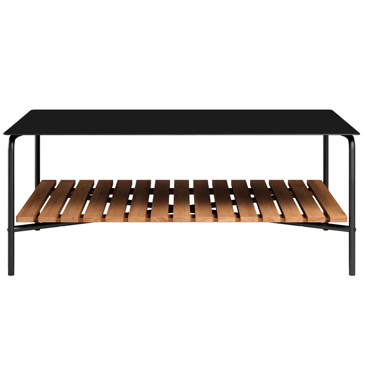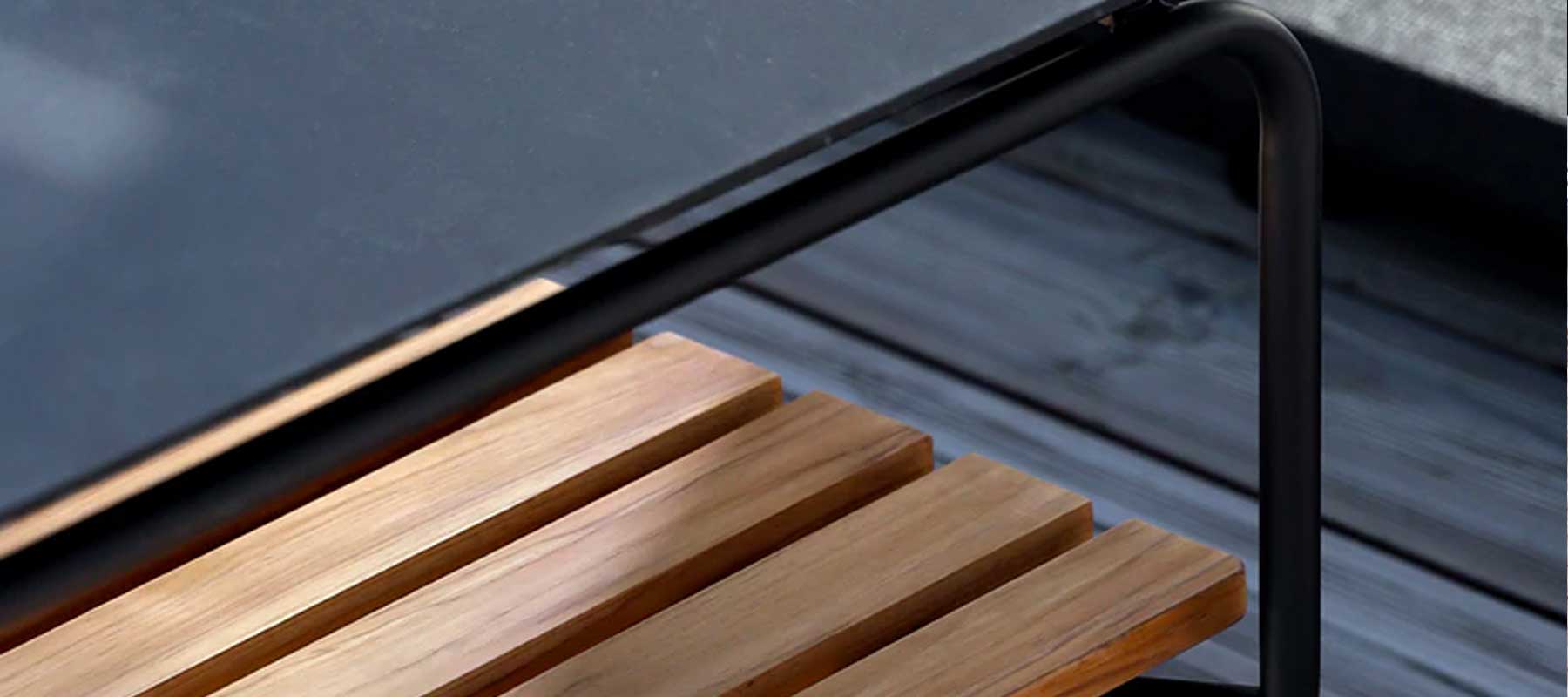 SACKit Patio sofabord er et udendørs sofabord i pulverlakeret aluminium med en hylde i teaktræ. Rene linjer, lækre materialer og et multifunktionelt design tager dit udendørsområde til et nye niveau. Saml familie eller venner til ren afslapning på de solrige sommerdage eller hyg dig i solskinsstrålerne en efterårsdag med en varm kop kaffe på bordet. Du kan have dit Patio sofabord stående ude i alt slags vejr – året rundt.