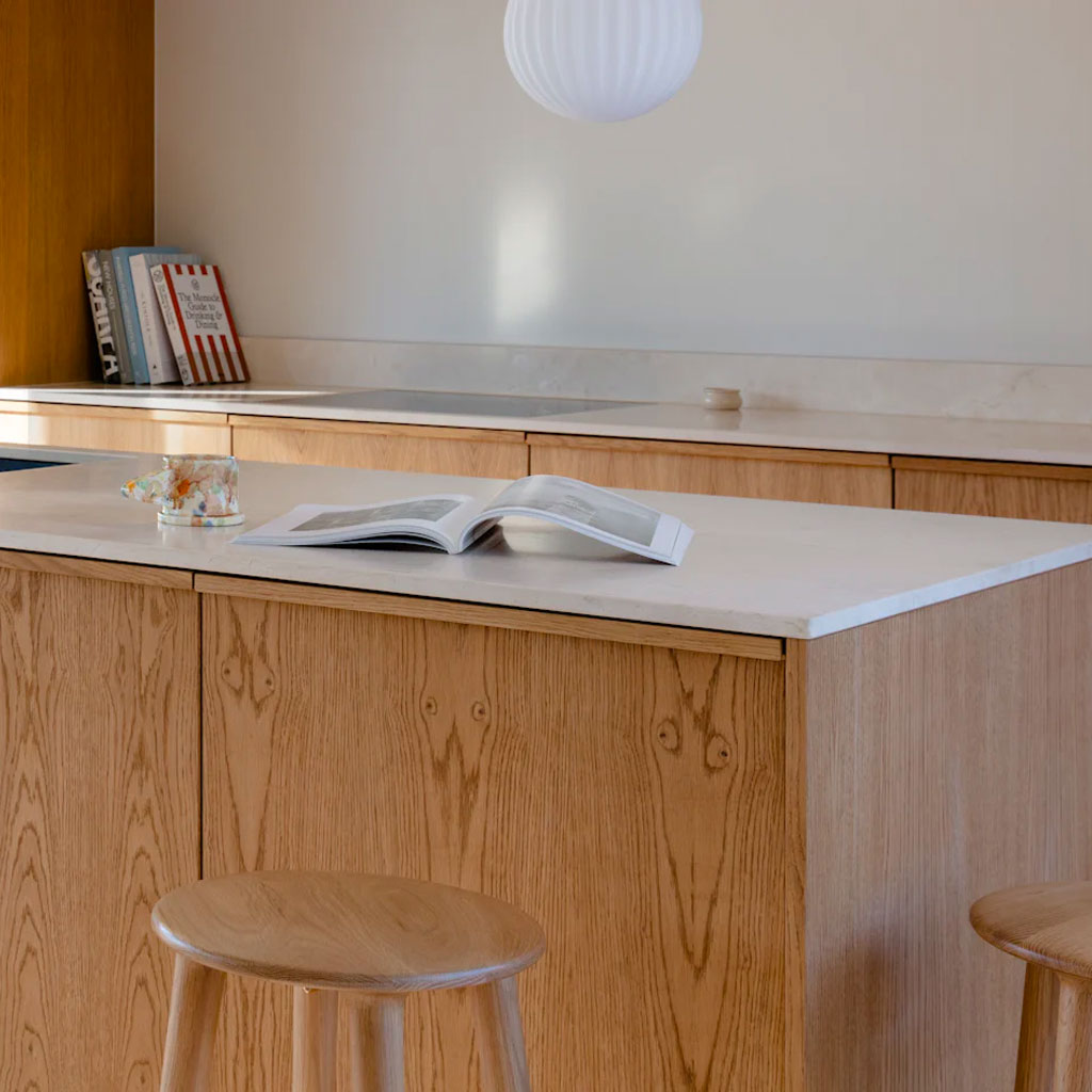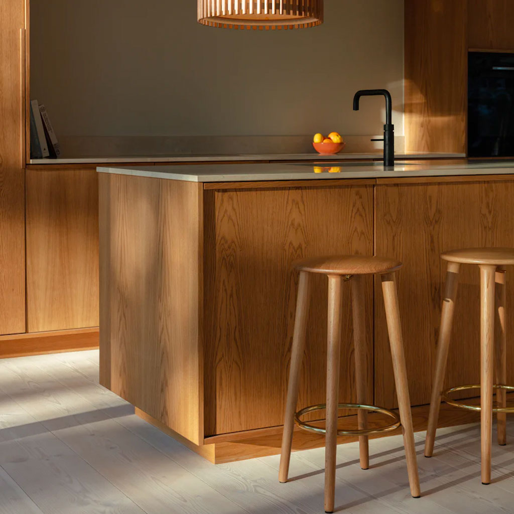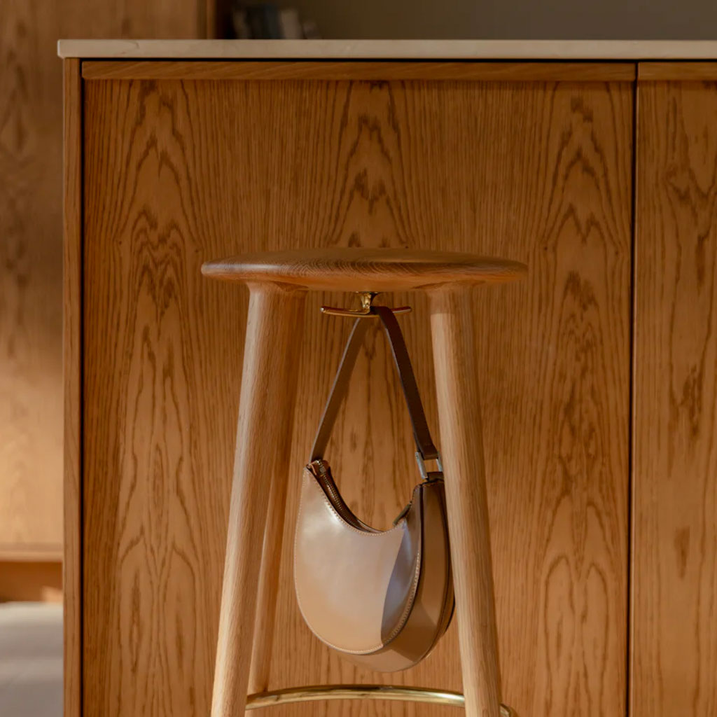 The Socialte counterstol er omhyggeligt designet med stor opmærksomhed på detaljer og håndværk. The Socialite counterstol er lavet af massivt egetræ og designet med en stilfuld fodstøtte og krog i messing, som løfter hjemmet - såvel som samtalerne.